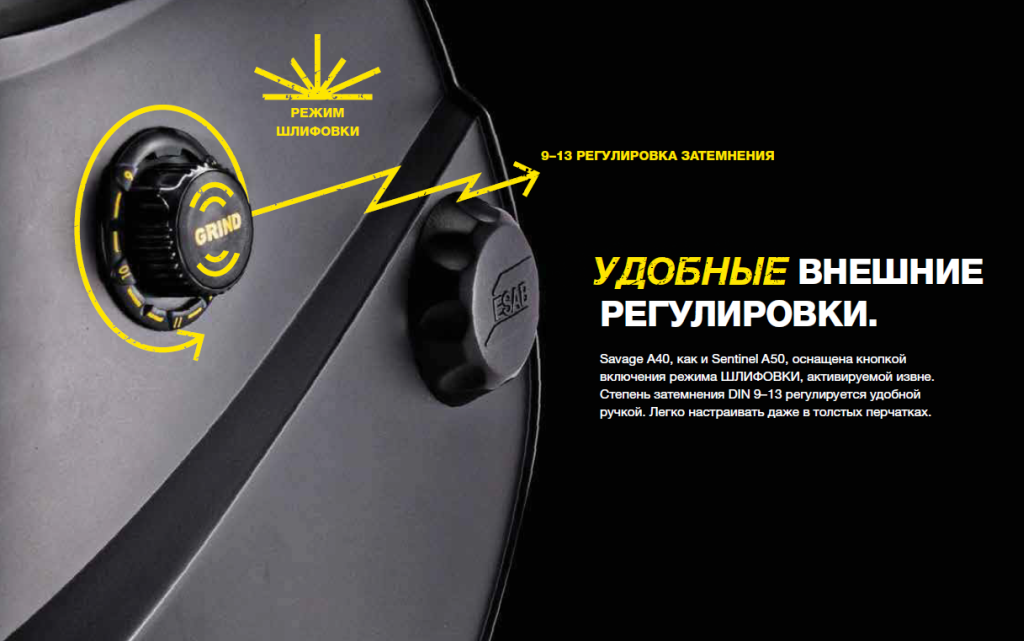 Плавная регулировка чувствительности и задержки осветления. Четыре датчика Savage A40 обеспечивают более быстрое и стабильное затемнение, особенно при сварке в нестандартных положения.