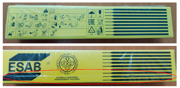 Цвет обмазки оригинальных электродов (электрод снизу) имеет серый оттенок, подделка (электрод сверху) – коричневый. Маркировка у оригинала менее четкая, линии маркировки (букв и цифр) толще. |
