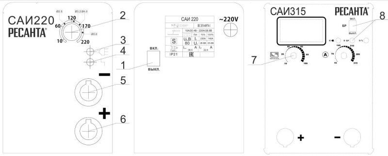 Инверторный сварочный аппарат САИ-315 выполнен в металлическом корпусе. На передней панели имеется регулятор величины сварочного тока (рис.1 поз.2), индикатор "сеть" (рис.1 поз.3), индикатор "перегрев" (рис.1 поз.4), а также силовые разъемы подключения сварочных кабелей (рис.1 поз.5,6). Сварочный аппарат САИ-315 оснащен принудительной системой 3 вентиляции, ввиду этого, категорически запрещается закрывать чем-либо вентиляционные отверстия в корпусе.