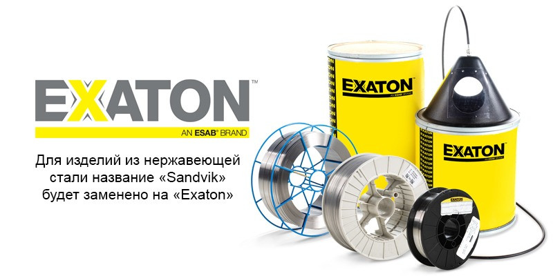 C 01 января 2020 года в связи с невозможностью продолжать производство материалов с использованием наименования Sandvik компания ESAB меняет названия сварочных материалов «Sandvik»и «Sanicro» на название «Exaton». Изменение связано исключительно с наименованием материалов. Все остальные параметры материалов, такие как качество и технические характеристики, упаковка не затрагиваются данным изменением и остаются на прежнем высоком уровне.