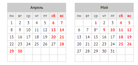 6, 7, 8* мая - рабочие дни (8 мая рабочий день сокращён на 1 час)