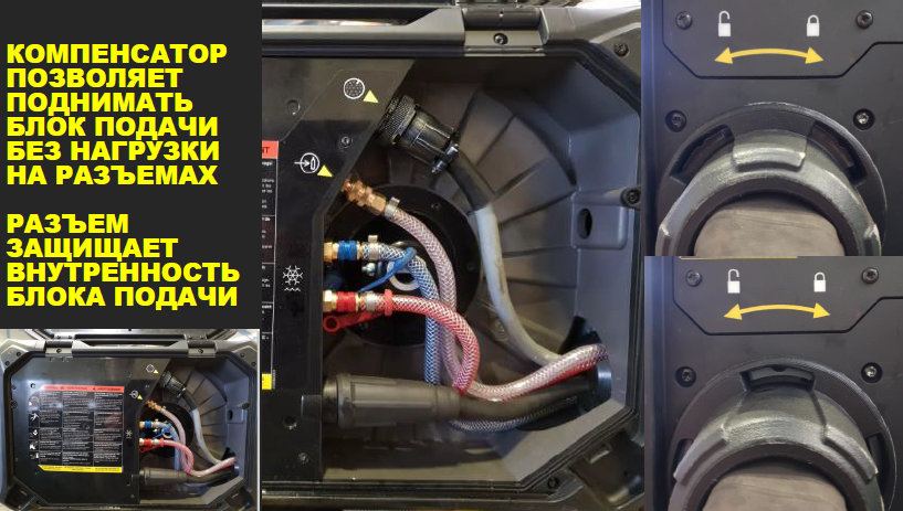 - Компенсатор позволяет поднимать блок подачи без нагрузки на разъемах