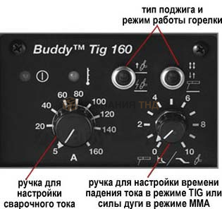 Панель управления Buddy Tig 160 чрезвычайно проста в использовании. Одна ручка используется для настройки сварочного тока, другая ручка - для настройки времени падения тока в режиме TIG или силы дуги в режиме ММА. Переключателями выбирается тип поджига и режим работы горелки.