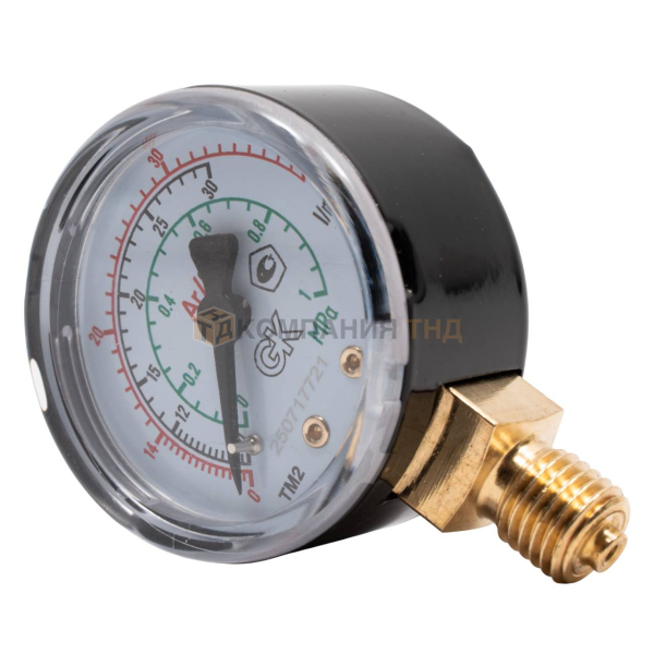 Расходомер (манометр) предназначена для измерения объемного расхода углекислого газа или аргона. Расходомер является неотъемлемой частью редуктора, вкручивается в основание с резьбой М12х1,5 с помощью ключа на 14. Штуцер имеет радиальное расположение и выполнен из латуни. Стальной корпуса манометра диаметром 50 мм защищён техническим (органическим) стеклом, циферблат выполнен из алюминия.