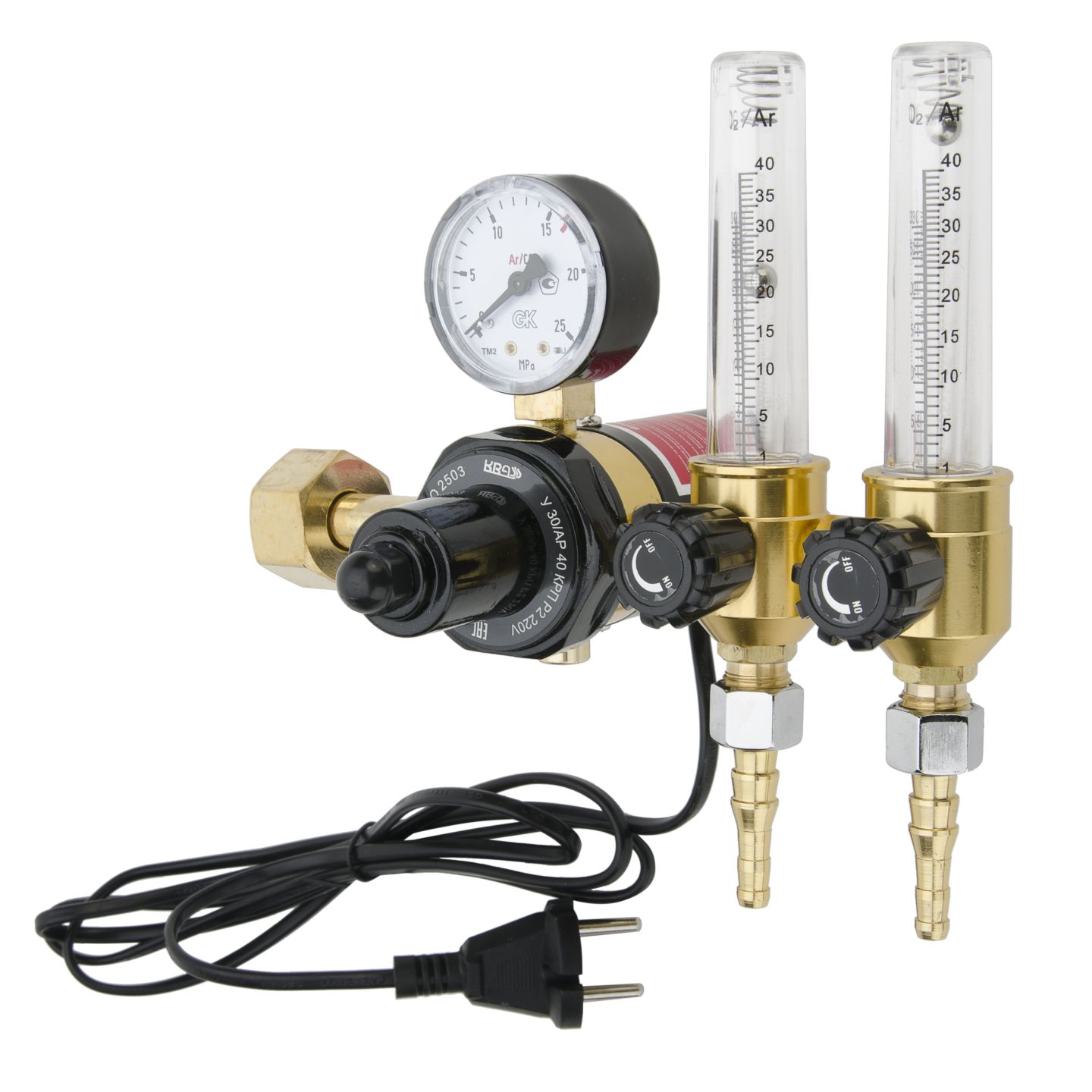 Регулятор для углекислого газа и аргона У 30/АР 40 КРП Р 220V с 2-мя ротаметрами и встроенным подогревателем 220V KRASS. Регулятор расхода газа предназначен для понижения и регулирования давления газа, поступающего в регулятор из баллона, и автоматического поддержания постоянным заданного расхода. Регуляторы выпускаются в климатическом исполнении УХЛ2 для типа атмосферы II и группы условий эксплуатации - 3 по ГОСТ 15150-69, но для работы в интервале температур от +5 до +50° С (от –30 до +50°С – с электроподогревателем ПУ-2).