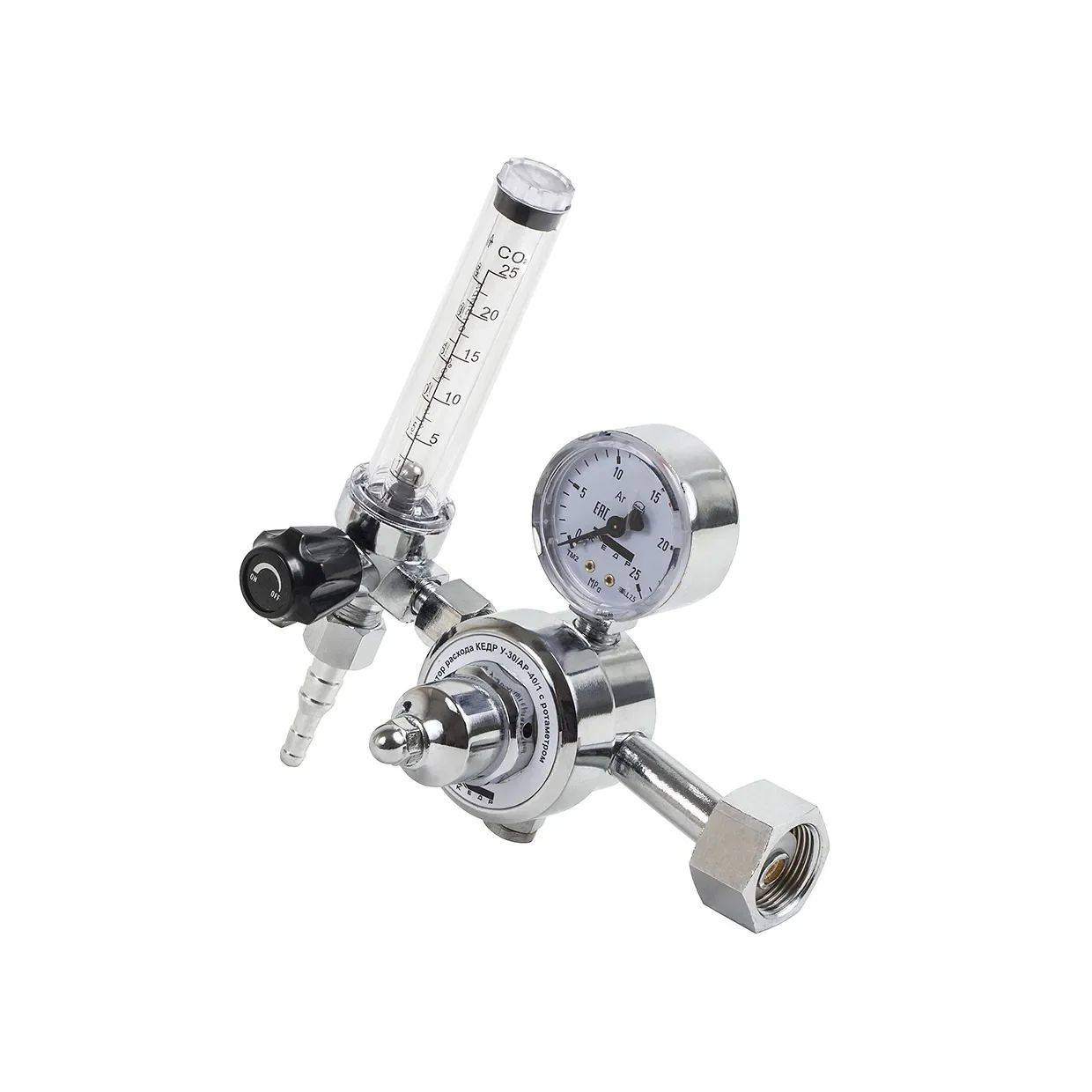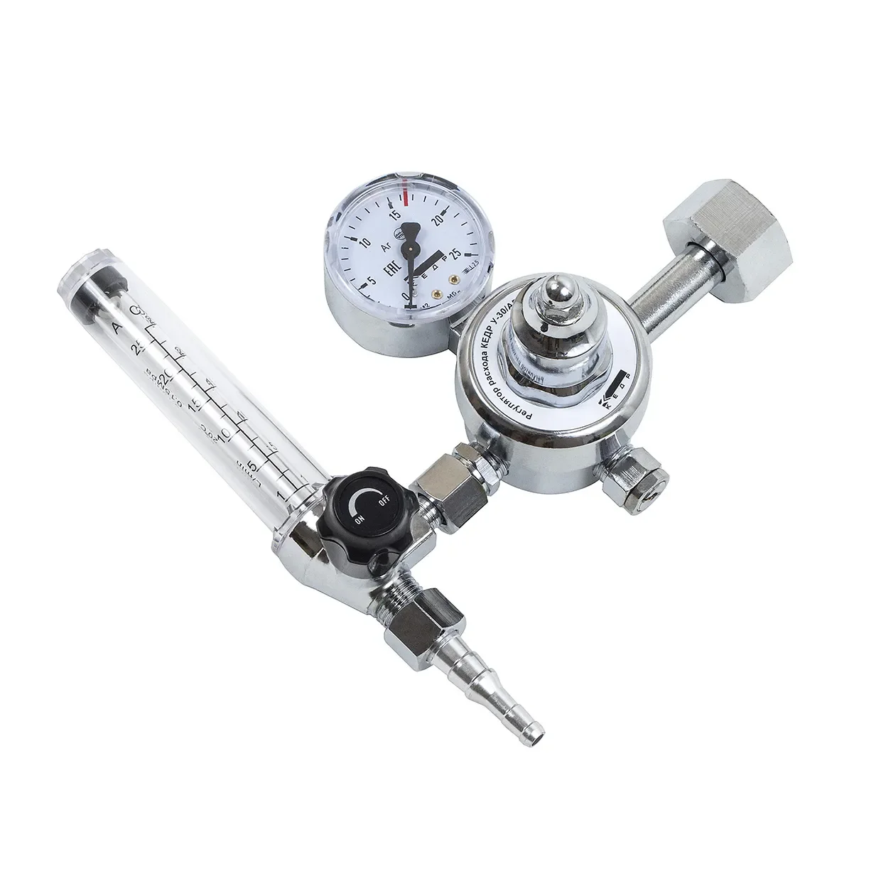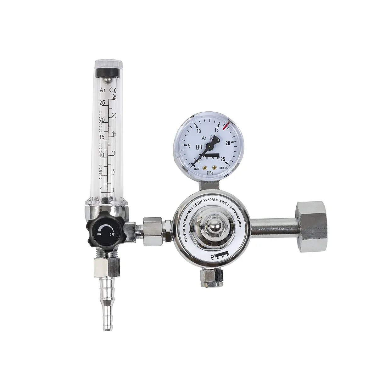 Регулятор расхода КЕДР У-30/АР-40/1 с ротаметром(8011695) предназначен для понижения давления защитного газа, подаваемого из магистрали или баллона, и поддержания постоянного заданного расхода при питании постов сварочного оборудования для MIG/MAG и TIG-сварки.