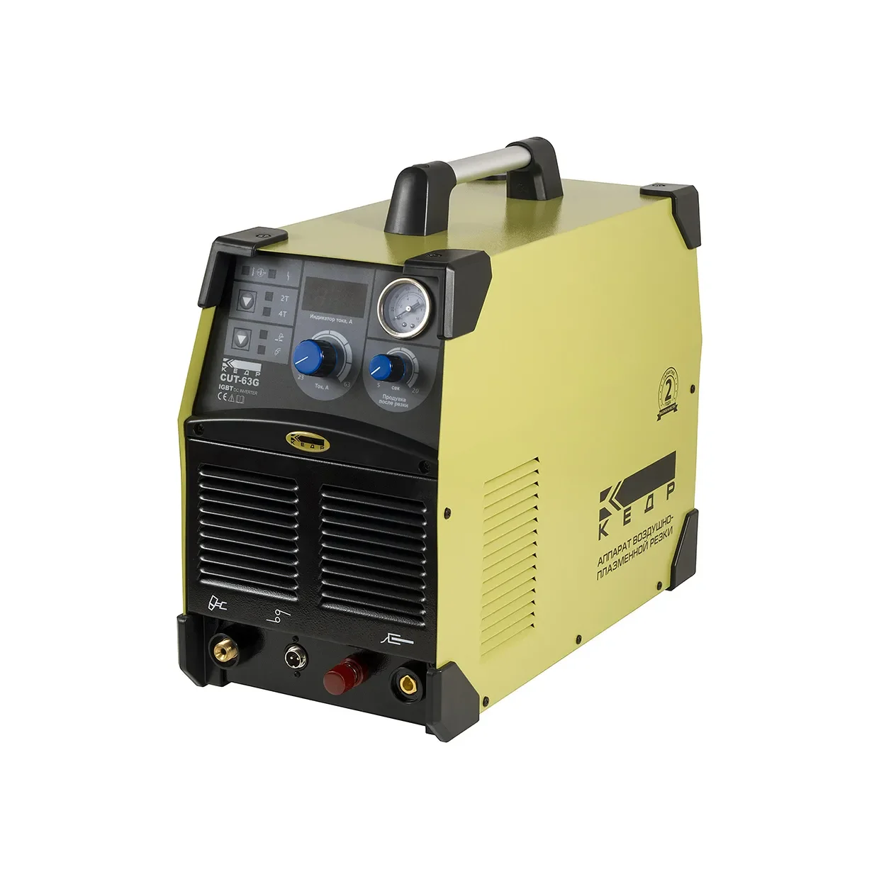 Установка воздушно-плазменная КЕДР CUT-63G (380В, 23-63А, 20 мм). Артикул 8004945. Аппарат воздушно-плазменной резки КЕДР CUT-63G КЕДР, 380В предназначен для плазменной резки любых токопроводящих материалов: углеродистые стали, нержавеющие стали, оцинкованные стали, алюминий, медь и различные сплавы. Бесконтактный поджиг дуги с высокочастотным управлением упрощает работу, позволяет без перерывов резать сетку и поверхности с отверстиями. При режущем токе 60А, аппарат способен справляться с углеродистой сталью толщиной до 20 мм, а при толщинах 15 мм уверенно чувствует себя даже на продолжительных работах не теряя в качестве резки.