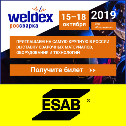 15 - 18 октября 2019 года Москва, КВЦ «Сокольники» Компания ЭСАБ приглашает посетить стенд на выставке Weldex / Россварка.