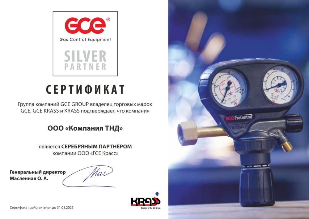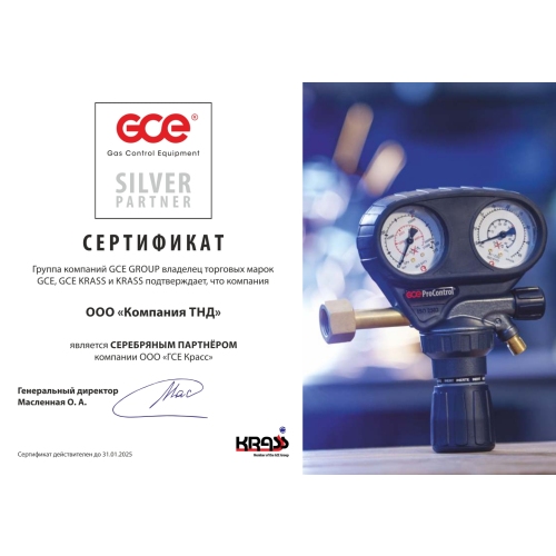 Владелец торговых марок GCE, GCE KRASS и KRASS - концерн GCE KRASS и Концерн ESAB признает Компанию ТНД СЕРЕБРЯНЫМ ПАРТНЁРОМ компании ООО "ГСЕ Красс", что является важным достижением для нас. Это означает, что нашим заказчикам предлагается широкий выбор высококачественного газосварочного оборудования, произведенного в соответствии с самыми строгими стандартами.