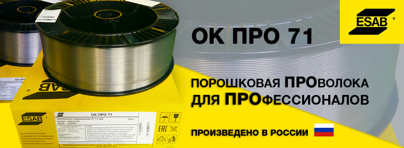 ОК ПРО 71 - рутиловая порошковая проволока, предназначенная для сварки в среде CO2 металлоконструкций из углеродистых и низколегированных сталей групп 1(М01) и 2(М03) с пределом текучести до 400 МПа, судостроительных сталей класса E400 и ниже во всех пространственных положениях.