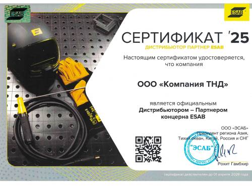 ООО «Компания ТНД» получила сертификат дистрибьютора-партнера ESAB на 2025 год. Узнайте больше о нашем сотрудничестве и преимуществах для клиентов.