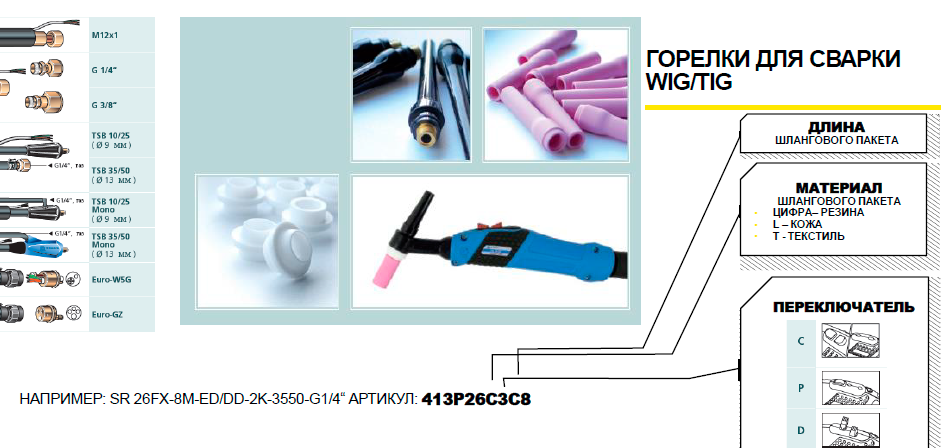 Последняя цифра артикула аргонодуговой горелки означает длину этой аргонодуговой горелки. Также обозначается, если мы считаем с конца третья цифра или буква с конца, она обозначает у нас материал, из которого изготовлена оплетка, кожух кабель-пакета. Вторая цифра с конца или буква, обозначает, какая будет кнопка. Возможно несколько видов переключателей.