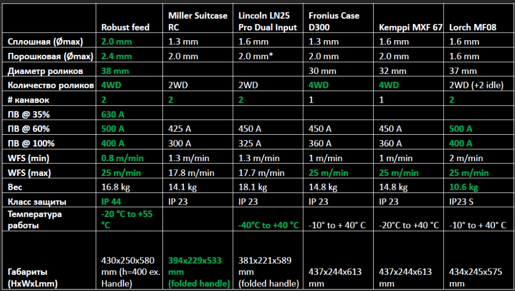 - До ø 2.0 мм для сплошной проволоки и ø 2.4 мм для порошковой проволоки